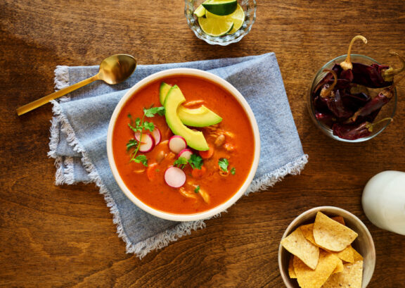 In a large stockpot or Dutch oven, heat oil on medium heat. Add guajillo peppers, onions, tomato paste, garlic, and tomatoes and cook for 3-4 minutes until tomato paste is caramelized and peppers are fragrant. Add 1 cup broth and bring to a boil. Cook 2-3 minutes. Puree mixture in a blender or food processor and transfer back to pot.